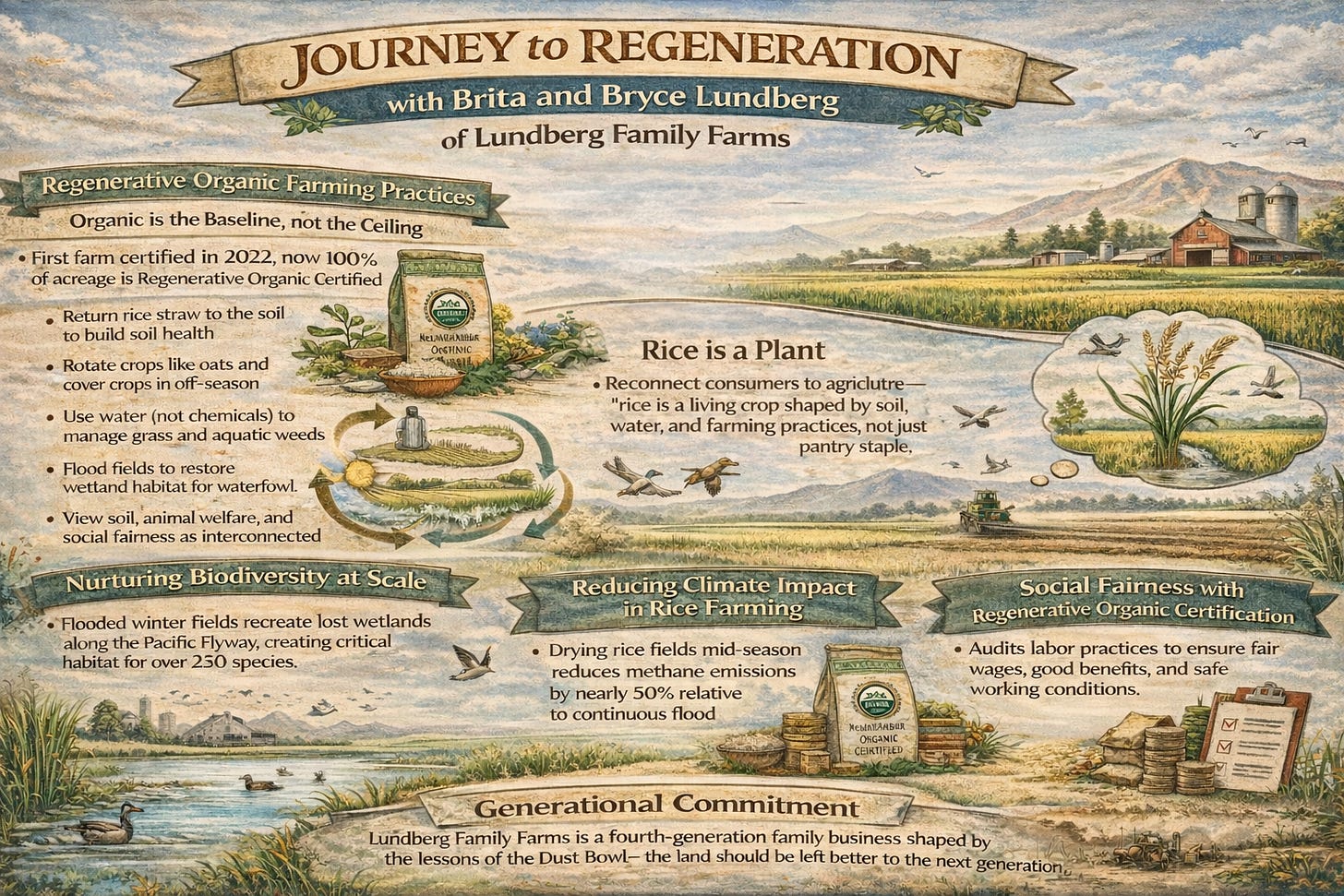 In this episode of Journey To Regeneration, Brita and Bryce Lundberg of Lundberg Family Farms offer a rare, grounded look at what regeneration means when practiced over generations. At Lundberg Family Farms, regenerative organic rice farming builds on decades of organic practices—returning rice straw to the soil, growing cover crops, and using water instead of chemicals to manage weeds. These methods improve soil health, reduce methane emissions, and recreate vital wetland habitat for hundreds of species. But regeneration as they discuss it is not only ecological. Through Regenerative Organic Certification, Lundberg formally integrates social fairness and labor standards into its farming model, reinforcing the idea that healthy food systems depend on healthy people. By translating these principles onto packaging and into everyday rice products, the company aims to reconnect consumers with how rice is grown—and why it matters. The result is a compelling case for taking the long view in agriculture and business alike.